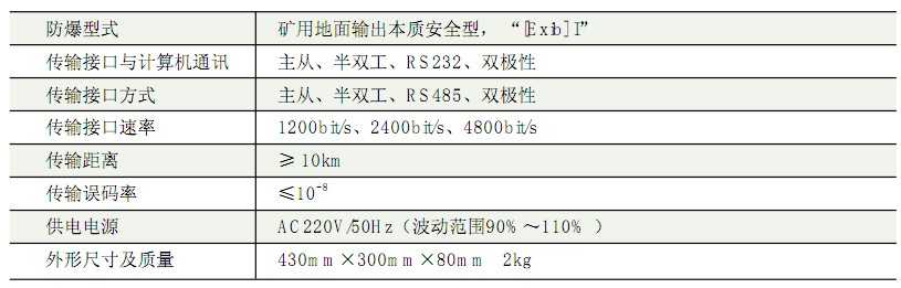 (以下簡(jiǎn)稱傳輸接口)是一種礦用數(shù)據(jù)信息轉(zhuǎn)換傳輸裝置,是本公司KJ70N型監(jiān)控系統(tǒng)的主要配套設(shè)備。傳輸接口以微處理器為核心,按標(biāo)準(zhǔn)的MODBUS通訊協(xié)議為主干,并采用先進(jìn)、獨(dú)特的雙向切換技術(shù),傳輸數(shù)據(jù)格式為透明傳輸方式,傳輸過程中只須TXDRXD,GND三根數(shù)據(jù)線。傳輸接口分三組信號(hào)輸出,兩組為井下分站傳輸(本安),另一組為地面分站傳輸(非安)。傳輸接口本安傳輸采用高速光電隔離器將RS232信號(hào)與外部數(shù)據(jù)總線信號(hào)有效且可靠的隔離,這樣傳輸接口的可靠性顯著增強(qiáng),同時(shí)也延長(zhǎng)了它的使用壽命。傳輸接口與KJ70N型監(jiān)控系統(tǒng)配合使用可實(shí)現(xiàn)雙機(jī)切換功能,同時(shí)傳輸接口提供一組非安DC18V/400mA調(diào)試電源(不得下井使用),為用戶在調(diào)試維修中提供方便。 主要技術(shù)指標(biāo)