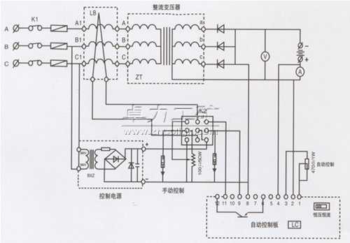 當電網電壓波動或負載波動而引起輸出整流電壓波動時,通過改變飽和電抗器的電抗變化來達到穩(wěn)定電壓的目的.由于礦燈充電電流是一個變化量,而電網電壓也是一個變化量.這二個量的不斷變化,使礦燈充電電壓同時作相應的變化,影響礦燈充電質量,影響礦燈充電質量,加入穩(wěn)壓裝置后這個變化量從輸出斷a b 二點取出,與控制器內部的標準量進行精密比較,再經 C 點輸出一個自動調整的變化量.放大后自動控制直流激磁電流的變化,使輸出電壓保持在整定值5±1%的范圍內,達到自動穩(wěn)壓的目的.
