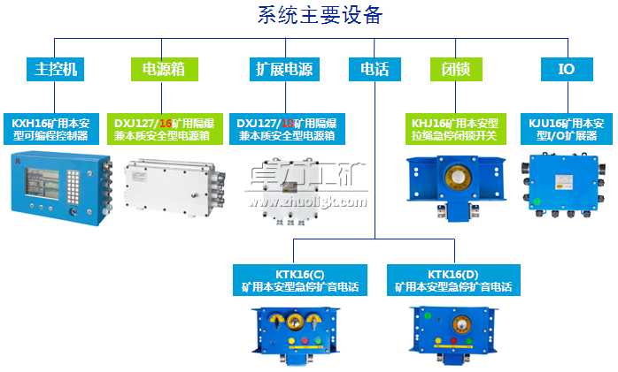裝置由KXH16礦用本安型可編程控制器、DXJ127/16礦用隔爆兼本質(zhì)安全型電源箱、DXJ127/18礦用隔爆兼本安型電源箱、KJU16礦用本安型I/O擴展器、JXJ0.05/127礦用隔爆兼本質(zhì)安全型變換箱、KHJ16礦用本安型急停閉鎖開關(guān)、KTK16(C)礦用本安型急停擴音電話、KTK16(D)礦用本安型急停擴音電話、電纜等組成,其中KXH16礦用本安型可編程控制器為系統(tǒng)核心部分。