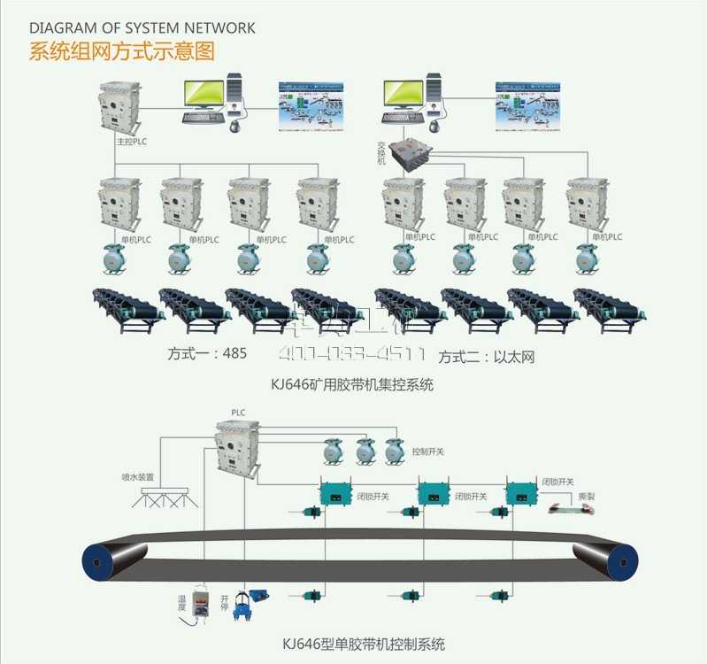 KJ646煤礦用帶式輸送機(jī)電控系統(tǒng)的設(shè)計(jì)是以《煤礦安全規(guī)程》為依據(jù),對煤礦井下實(shí)際情況進(jìn)行考察之后,綜合各方面的要求設(shè)計(jì)出來的,監(jiān)控設(shè)備的種類、數(shù)量、性能符合《煤礦安全規(guī)程》的有關(guān)規(guī)定,適用各類大中小型煤礦。該系統(tǒng)可采集跑偏、閉鎖、撕裂、溫度、煙霧、速度、煤位等性能參數(shù),以及設(shè)備開停等生產(chǎn)參數(shù),可以控制設(shè)備的起動(dòng)、停止,是煤礦安全生產(chǎn)的必備設(shè)備。