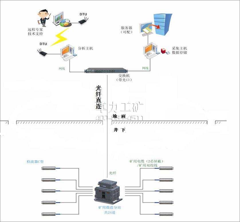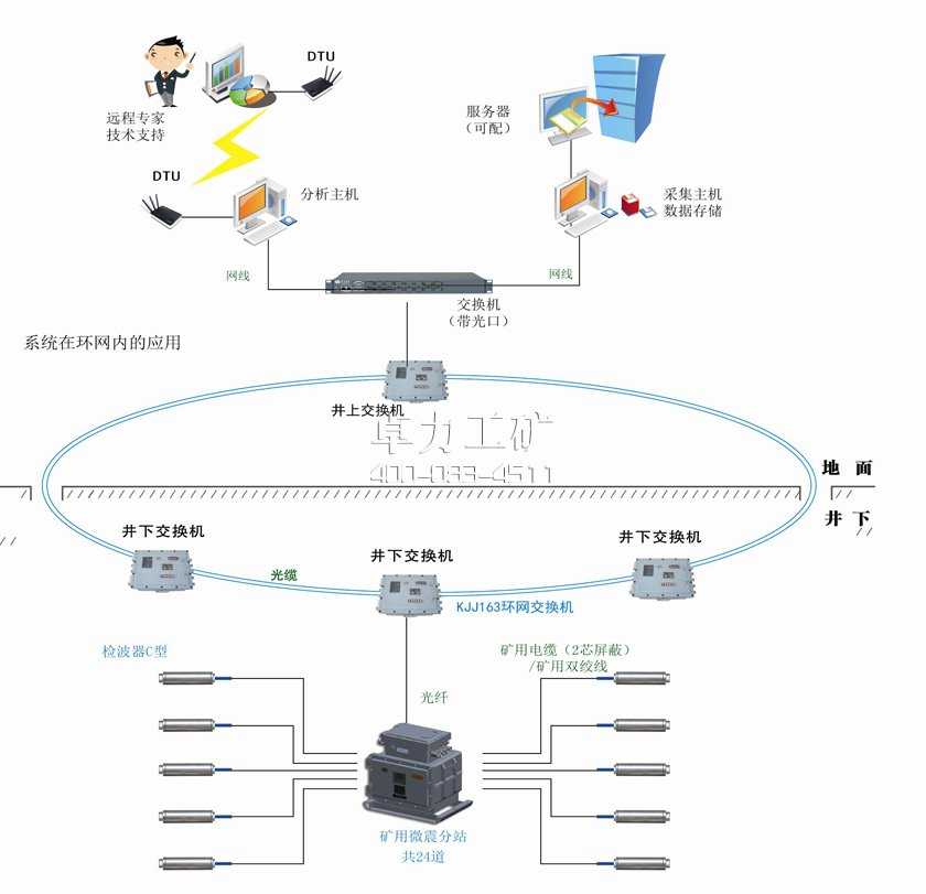 礦用微震系統(tǒng)由采集主機(服務(wù)器)、分析主機、交換機、信號傳輸設(shè)備(電轉(zhuǎn)光口設(shè)備、光纜、電纜、接線盒)、KJ699礦用微震監(jiān)測分站、拾震器GZC4.5A、環(huán)網(wǎng)交換機(地面交換機)、UPS電源、服務(wù)器等組成。