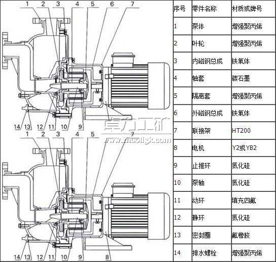 過流部件材質(zhì):PP(增強(qiáng)聚丙烯)、PVF2(聚偏二氟乙烯)