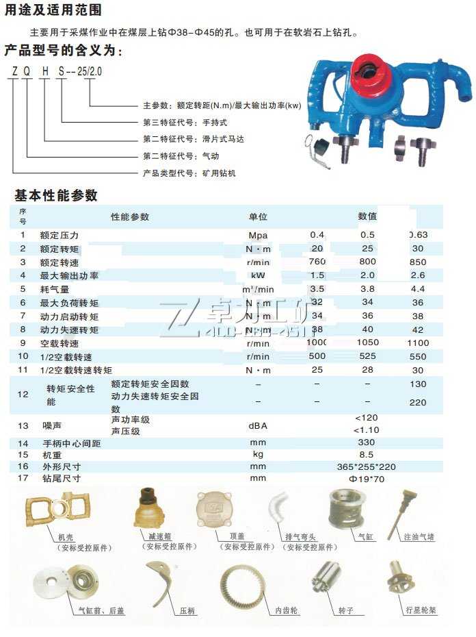 ZQHS系列氣動(dòng)手持式鉆機(jī)型號(hào):ZQHS-25/2.0、ZQS-30/2.5、ZQHS-35/2.0、ZQHS-40/2.1、ZQHS-45/2.3、ZQHS-45/2.3C大轉(zhuǎn)矩手持沖水式?jīng)_擊式氣動(dòng)鉆機(jī)